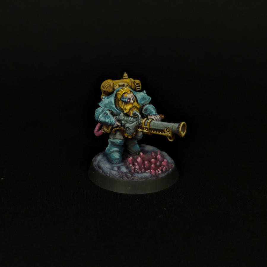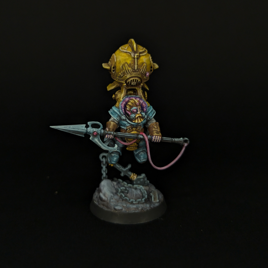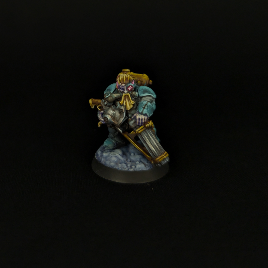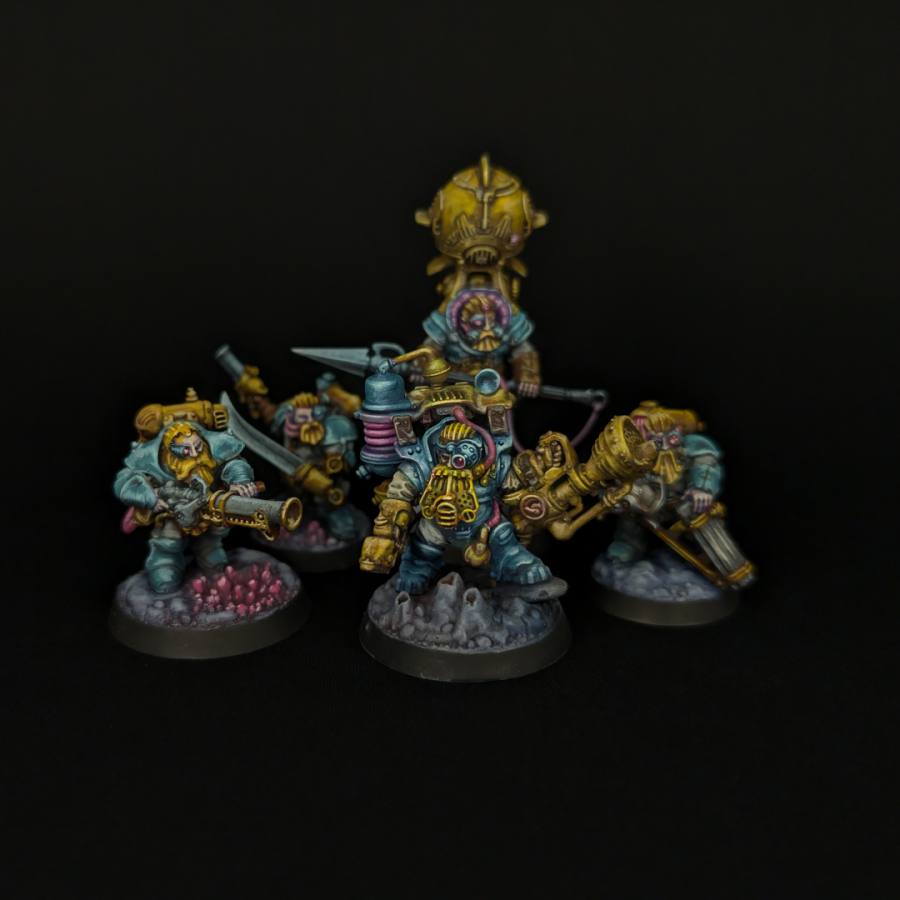 This pairing creates a striking contrast that’s both modern and dynamic. Cyan evokes a sense of energy and clarity, perfect for their aether-gold-fueled adventures, while magenta adds a touch of regal vibrancy and mystery. Together, they make the Profiteers stand out on the tabletop like no other warband.